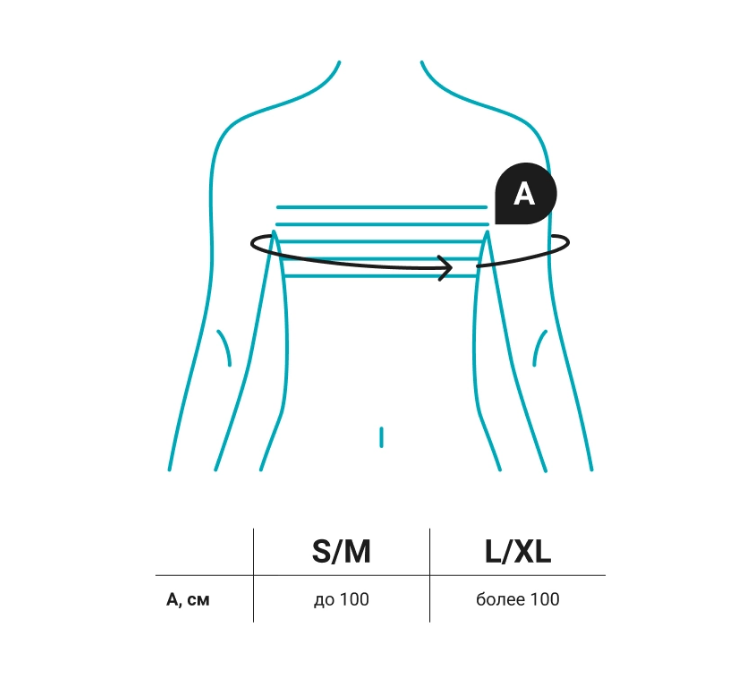 - Чтобы данная модель была комфортна пациентам с размером одежды более 52 см, и в то же время не имела большой запас фиксирующего пояса у пациентов с размером одежды менее 44 см., в бандаже предусмотрены два размера (S/M и L/XL), отличающийся по длине фиксирующего пояса и наплечных ремней