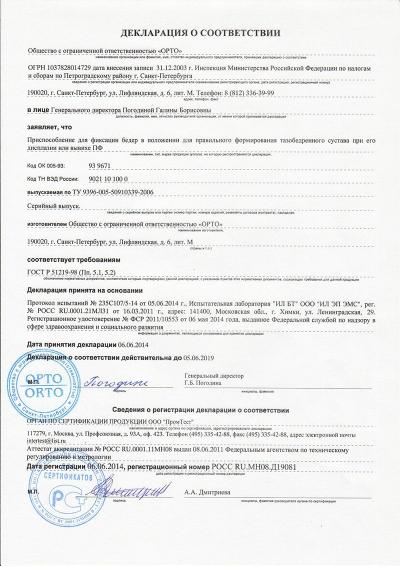 Ортез с разъемной эластичной основой анатомической формы. Фиксирующие элементы представлены двумя широкими и двумя узкими эластичными ремнями, являющимися продолжением основы, и дополнительным пятым ремнем для создания «акцента» фиксации. Ремни по краям снабжены специальными «карманами», в центре лентами-индикаторами натяжения. Гибкие планшетки в основе предотвращают скручивание. На концах ремней расположены застежки «Велкро». Основной материал ортеза — аэропрен.