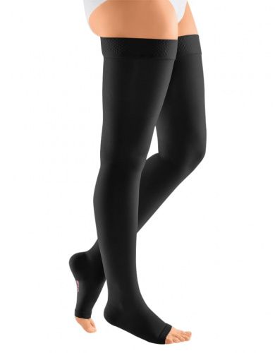 Компрессионные чулки 1-ого класса компрессии mediven plus с открытым носком и силиконовой резинкой на широкое бедро как универсальное решение в лечении заболеваний вен.